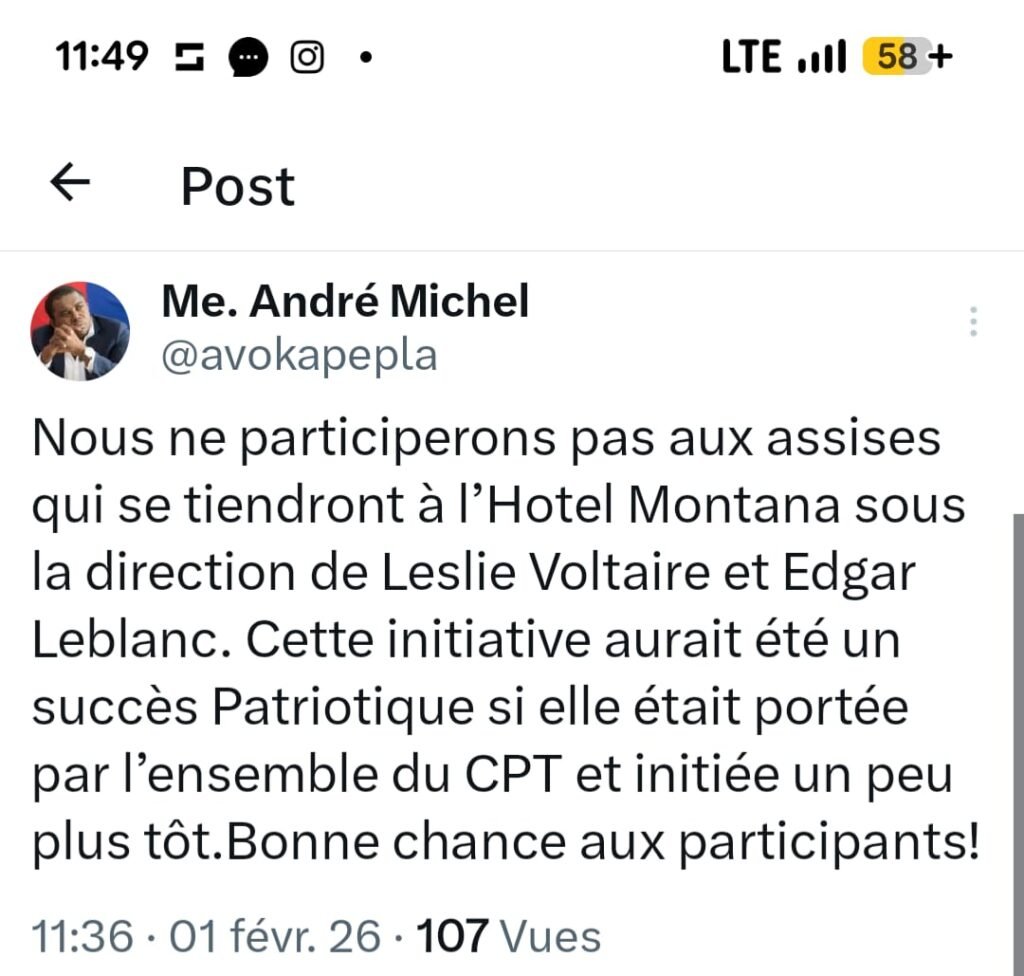 Ce 1er février 2026, à 11h36, Me André Michel a officiellement annoncé sur Twitter son refus de participer aux assises organisées à l’Hôtel Montana sous la direction de Leslie Voltaire et Edgar Leblanc. Il a affirmé que cette initiative « aurait été un succès patriotique » si elle avait été portée par l’ensemble du Conseil de Transition Politique (CPT) et lancée plus tôt, marquant ainsi une rupture claire avec certains acteurs clés du CPT, alors que ce dernier arrive à la fin de son mandat.